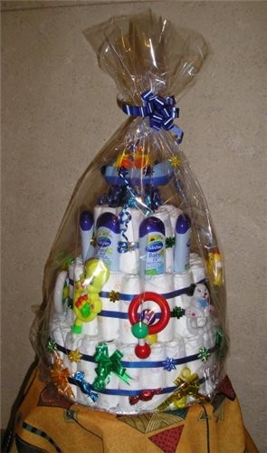 - декоративная атласная лента, бантики, бабочки, 2 погремушки, 2 прорезывателя, слюнявчик, шампунь и пена для купания, крем под подгузник, масло для массажа, жидкое мыло